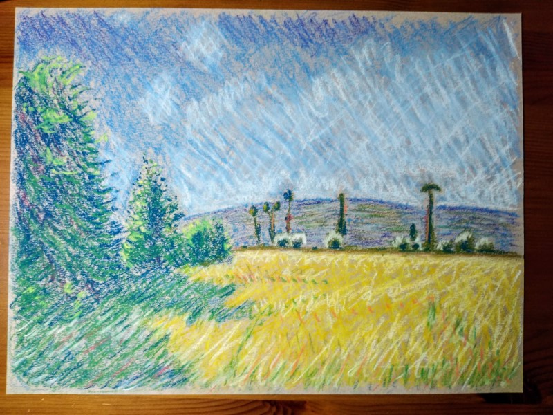 In the fall, I took an Understanding Color class that used oil pastels. Although I learned a lot about color and color theory, I didn’t quite master the use of oil pastels during the class. I struggled with layering colors without muddying things up and getting enough coverage. Here is one project example from the class: